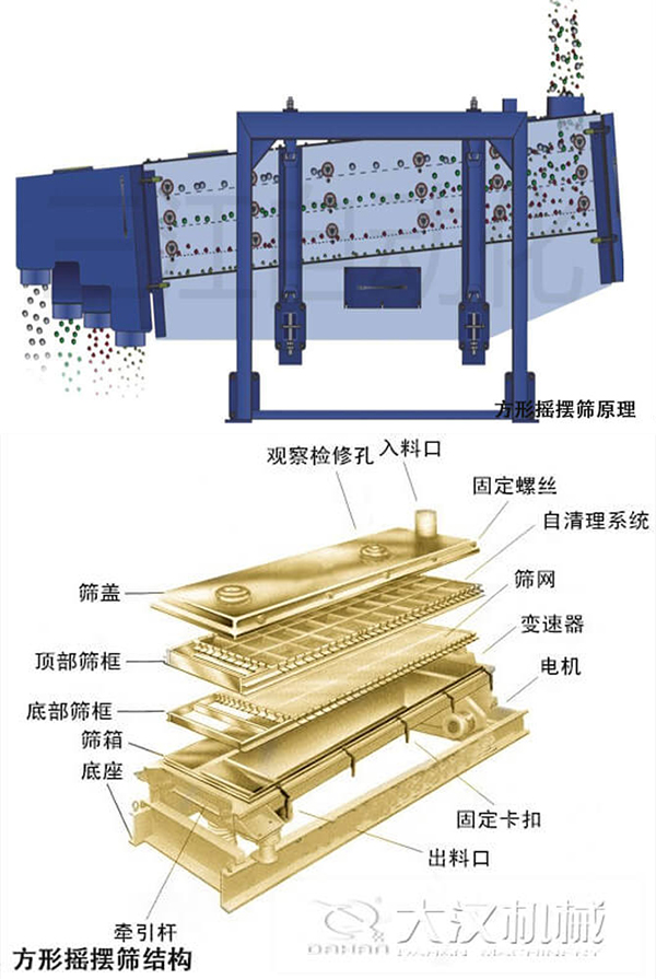 方形搖擺篩的主要結(jié)構(gòu)有:傳動(dòng)裝置,布料器,篩箱,支撐架,驅(qū)動(dòng)裝置等。