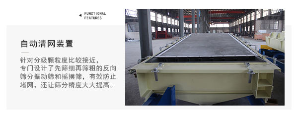 ★自動(dòng)清網(wǎng)裝置種類較多,自清網(wǎng)效果好;針對(duì)分級(jí)顆粒度比較接近,分級(jí)時(shí)有靜電起球且易堵網(wǎng)的物料,我公司專門設(shè)計(jì)了先篩細(xì)再篩粗的反向(反向篩分)篩分振動(dòng)篩和搖擺篩,不但有效防止了堵網(wǎng),還讓篩分精度大大提高;