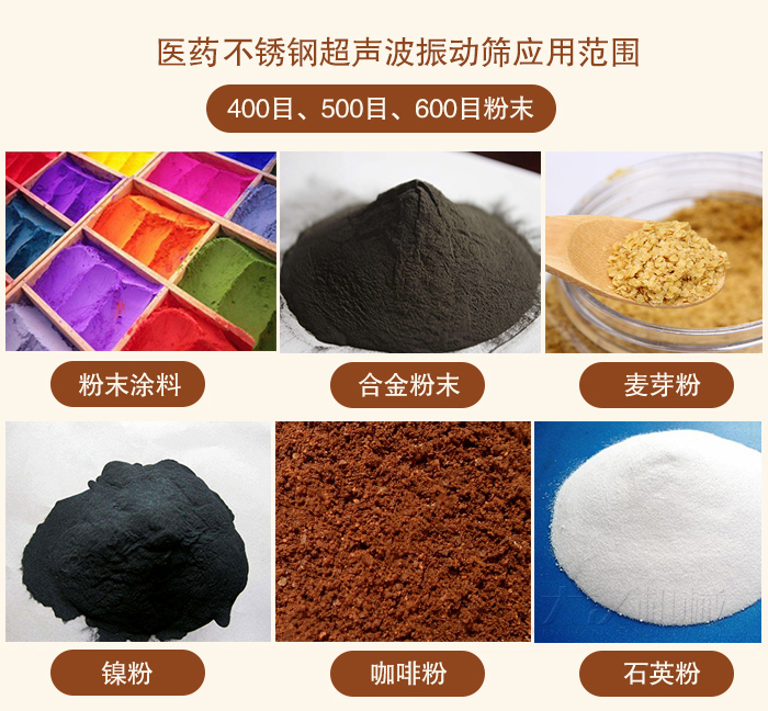 400目、500目、600目篩分碳化硅、合金粉末、鉬粉、不銹鋼粉、鎢粉、鎳粉、鈷粉、粉末涂料、石英粉、丁米酮粉、麥芽粉、咖啡粉、電磁粉、負極材料、激光粉。